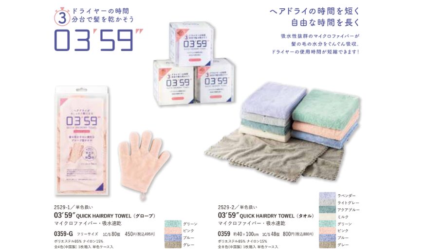 0359タオル(タオルタイプ)は全3タイプのサイズ展開があり、上記は『ヘアドライ用』で、他に全身包み込むビッグサイズと、一番小さいミニタオルの3種類があります。